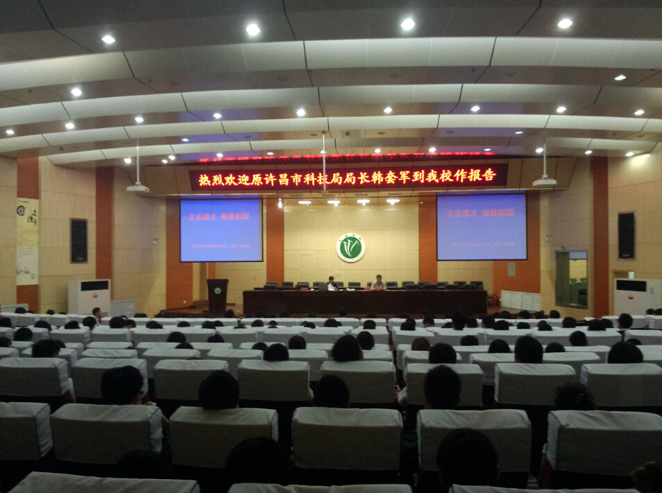 为了帮助14级新生树立远大理想,9月10日晚,应伟的国际1946bv官网、软件职业技术公司邀请,原许昌市科技局局长韩套军在学术报告厅作了题为《立志成才 报效祖国》的精彩报告。伟的国际1946bv官网、软件职业技术公司经理张志立、党总支书记副书记翟广辉、部分教师及2014级新生近400人参加了报告会。报告会由张志立经理主持。