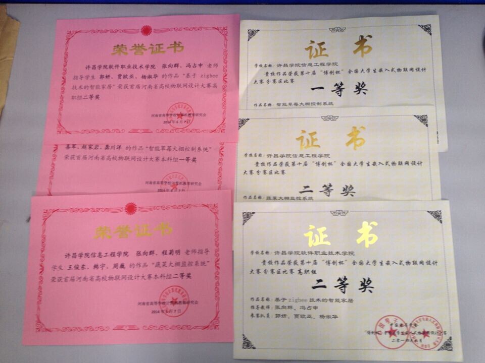 6月6日至7日,第十届“博创杯”全国老员工嵌入式物联网设计大赛(河南赛区)暨首届河南省高校物联网设计大赛在郑州轻工业公司举办。来自省内高校多支队伍参赛,公司共派出3支代表队参加了本次比赛并获佳绩。其中由张向群、王闯老师指导,姚喜军、赵家岩、龚川洋等同学设计的作品“智能草莓大棚控制系统”获得本科组一等奖;由张向群、程菊明、王闯、冯战申等老师指导,王俊东、韩宇、周巍等同学设计的作品“蔬菜大棚监控系统”、郭妍、贾欧亚、杨淑华等同学设计的作品“基于zigbee技术的智能家居”分别获得本科组二等奖、高职组二等奖。