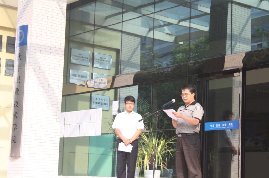 教师代表、办公室主任王晓霞老师和员工代表、员工会主席裴新华同学分别发言。王老师表示要把浓浓的爱国热情融入到本职工作中去,融入到日常的教书育人工作中去,用自己的实际行动承担起历史的重任,为教育事业奋斗终身!“少年智则国智,少年富则国富,少年强则国强”裴新华同学说,我们应理性爱国,把爱国热情落实到实际行动中去,让爱国之心如愿以偿。